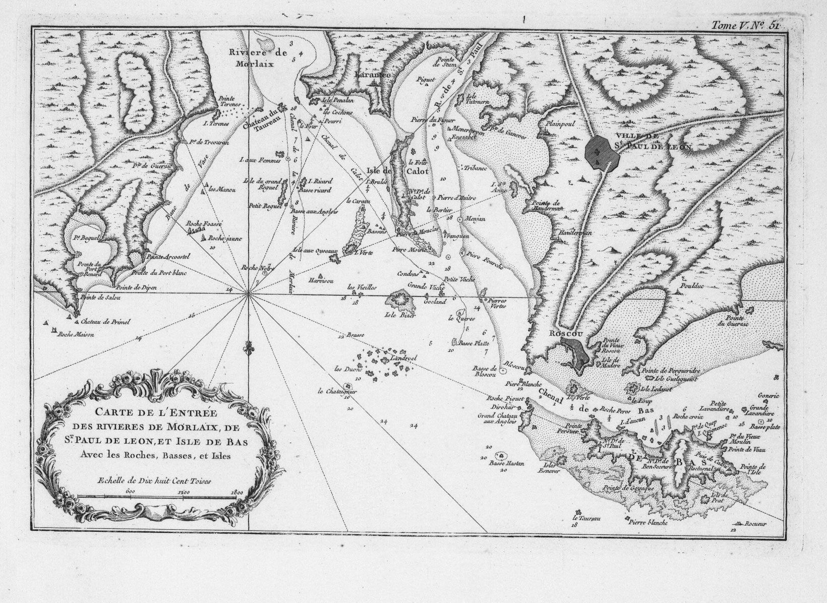 Carte de l'entrée des rivieres de Morlaix, de St Paul de Léon et Isle de Bas avec les roches, basses, et isles.