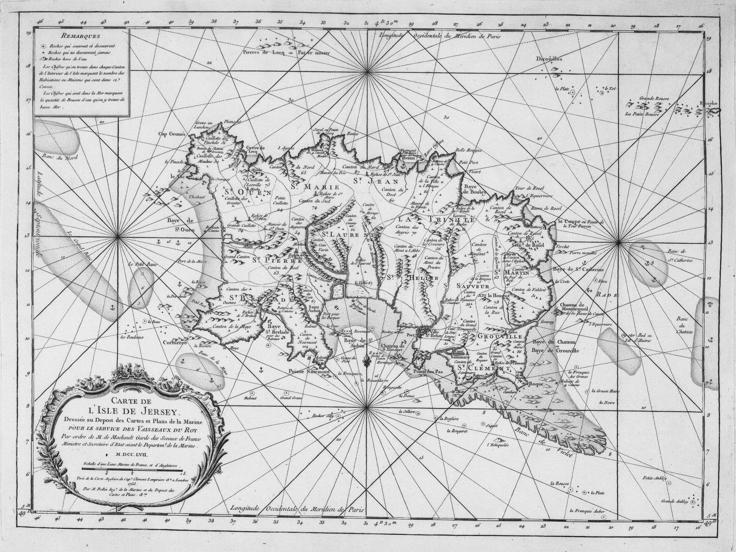 Dressée au Depost des cartes et plans de la Marine Pour le service des vaisseaux du Roy Par ordre de M. Machault garde des sceaux de France, ministre et secrétaire d'Etat.